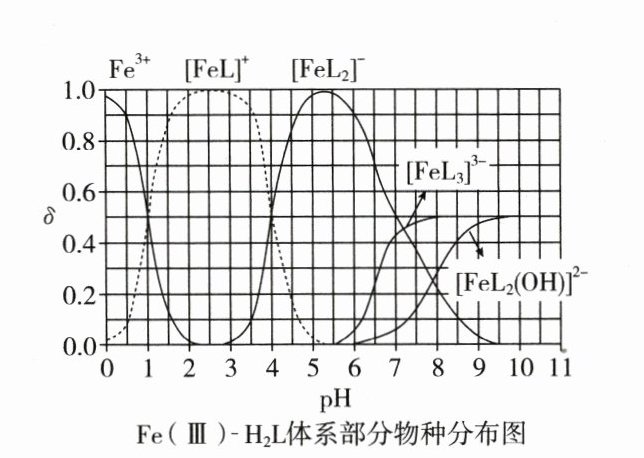C [从题图中可以看出$Fe(Ⅲ)$主要与$L^{2 - }$进行络合,但在$pH = 1$时,富含$L$的物种主要为$H_2L$,此时电离出的$HL^ - $较少,根据$H_2L$的一级电离常数可以简单计算$pH = 1$时溶液中$c(HL^ - )\approx5\times10^{ - 9.46}\ mol\cdot L^{ - 1}$,但$pH = 1$时$c(OH^ - ) = 10^{ - 13}\ mol\cdot L^{ - 1}$,此时含铁的物种为$Fe^{3 + }$和$[FeL]^ + $且相等,则$c([FeL]^ + ) = 1\times10^{ - 4}\ mol\cdot L^{ - 1}$,因此这四种粒子的浓度大小为$c(H_2L)>c([FeL]^ + )>c(HL^ - )>c(OH^ - )$,$A$错误;当$pH = 10$时,可计算$\frac{c(L^{2 - })}{c(HL^ - )}=\frac{K_{a2}}{c(H^ + )}=10^{ - 2.4}$,$\frac{c(HL^ - )}{c(H_2L)}=\frac{K_{a1}}{c(H^ + )}=10^{2.54}$,故在$pH = 10$时$HL^ - $的含量最大,$B$错误;$L^{2 - } + [FeL]^ + \rightleftharpoons[FeL_2]^ - $的平衡常数$K=\frac{c([FeL_2]^ - )}{c([FeL]^ + )\cdot c(L^{2 - })}$,当$[FeL_2]^ - $与$[FeL]^ + $分布分数相等时(浓度均为$1\times10^{ - 4}\ mol\cdot L^{ - 1}$),$K=\frac{1}{c(L^{2 - })}$,此时体系的$pH = 4$,$\frac{c(HL^ - )}{c(H_2L)}=\frac{K_{a1}}{c(H^ + )}=\frac{10^{ - 7.46}}{10^{ - 4}} = 10^{ - 3.46}$,$\frac{c(L^{2 - })}{c(HL^ - )}=\frac{K_{a2}}{c(H^ + )}=\frac{10^{ - 12.4}}{10^{ - 4}} = 10^{ - 8.4}$,则可认为此时体系中$c(H_2L)\approx c_0(H_2L)=5.0\times10^{ - 3}\ mol\cdot L^{ - 1}$,$K_{a1}\cdot K_{a2}=\frac{c(L^{2 - })\cdot c^2(H^ + )}{c(H_2L)}$,代入数据可以计算溶液中$c(L^{2 - })=5.0\times10^{ - 14.86}$,则该络合反应的平衡常数$K\approx10^{14.16}$,即$\lg K\approx14$,$C$正确;根据题图,$pH = 10$时溶液中主要的含$Fe$物种为$[FeL_3]^{3 - }$和$[FeL_2(OH)]^{2 - }$,其分布分数均为$0.5$,因此可以得到$c([FeL_3]^{3 - })=c([FeL_2(OH)]^{2 - })=1\times10^{ - 4}\ mol\cdot L^{ - 1}$,此时形成$[FeL_3]^{3 - }$消耗了$3\times10^{ - 4}\ mol\cdot L^{ - 1}$的$L^{2 - }$,形成$[FeL_2(OH)]^{2 - }$消耗了$2\times10^{ - 4}\ mol\cdot L^{ - 1}$的$L^{2 - }$,共消耗了$5\times10^{ - 4}\ mol\cdot L^{ - 1}$的$L^{2 - }$,即参与配位的$c(L^{2 - })\approx5\times10^{ - 4}\ mol\cdot L^{ - 1}$,$D$错误。]