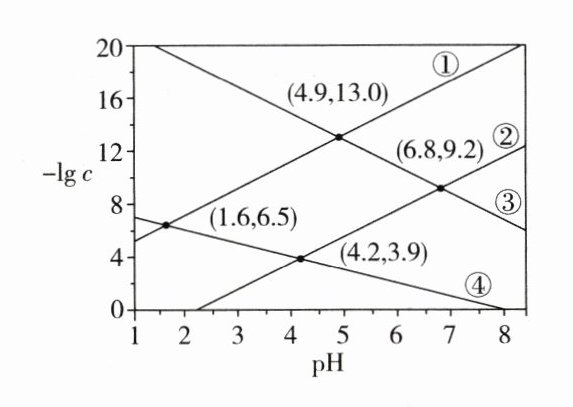 D [$H_2S$饱和溶液中,随$pH$升高,$HS^-$、$S^{2 - }$浓度逐渐增大,$Ni^{2 + }$、$Cd^{2 + }$浓度逐渐减小,则$ - \lg c(HS^ - )$和$ - \lg c(S^{2 - })$随$pH$的升高而减小,$ - \lg c(Ni^{2 + })$和$ - \lg c(Cd^{2 + })$随$pH$的升高而增大。$pH$相同时,$HS^ - $浓度大于$S^{2 - }$浓度,即$ - \lg c(HS^ - )$小于$ - \lg c(S^{2 - })$,则③为$pH$与$ - \lg c(S^{2 - })$的关系曲线,④为$pH$与$ - \lg c(HS^ - )$的关系曲线;$S^{2 - }$浓度相同时,由于$K_{sp}(NiS)>K_{sp}(CdS)$,所以$Cd^{2 + }$浓度更小,即$ - \lg c(Ni^{2 + })$小于$ - \lg c(Cd^{2 + })$,则①为$pH$与$ - \lg c(Cd^{2 + })$的关系曲线,②为$pH$与$ - \lg c(Ni^{2 + })$的关系曲线。由点$(4.9,13.0)$可知,$K_{sp}(CdS)=c(Cd^{2 + })\cdot c(S^{2 - })=10^{ - 13}\times10^{ - 13}=10^{ - 26}$,$A$错误;$K_{a1}=\frac{c(H^ + )\cdot c(HS^ - )}{c(H_2S)}=\frac{c(H^ + )\cdot c(HS^ - )}{0.1}$为定值,代入④上两组数据计算,$K_{a1}=\frac{10^{ - 1.6}\times10^{ - 6.5}}{0.1}=\frac{10^{ - 4.2}\times10^{ - 3.9}}{0.1}=10^{ - 7.1}$,④代表$pH$与$ - \lg c(HS^ - )$的关系曲线,$B$、$C$错误;取③上任一组数据计算$K_{a2}(H_2S)=\frac{c(H^ + )\cdot c(S^{2 - })}{c(HS^ - )}=\frac{10^{ - 6.8}\times10^{ - 9.2}}{c(HS^ - )}=\frac{10^{ - 6.8}\times10^{ - 9.2}}{\frac{K_{a1}\times0.1}{10^{ - 6.8}}}=10^{ - 14.7}$,$D$正确。]