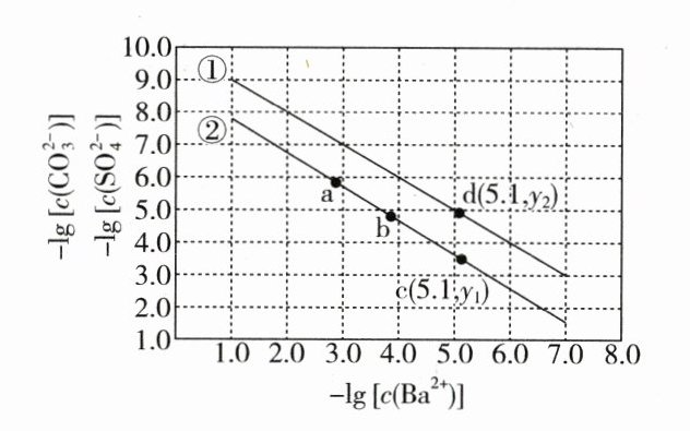 D. $c(Ba^{2 + })=10^{-5.1}$ 时两溶液中 $\frac{c(SO_{4}^{2 - })}{c(CO_{3}^{2 - })} = 10^{y₂ - y₁}$