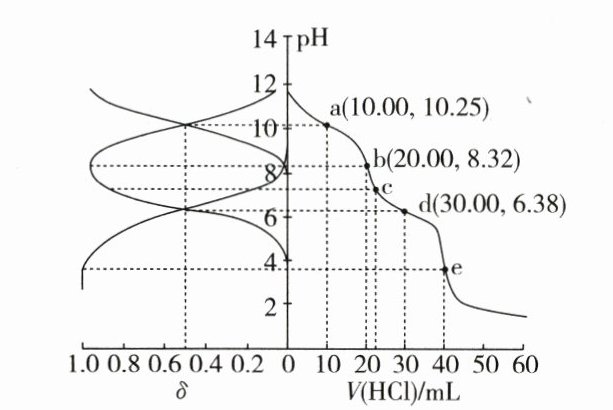 5.(2021·辽宁高考)用 $0.1000\ mol·L^{-1}$ 盐酸滴定 $20.00\ mL\ Na₂A$ 溶液,溶液中 $H₂A$、$HA^{-}$、$A^{2 - }$ 的分布分数 $\delta$ 随 pH 变化曲线及滴定曲线如图。下列说法正确的是 ( )