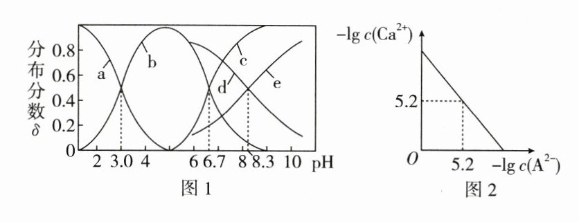 7.(2023·河北邢台高三一模)已知常温下水溶液中 $H₂A$、$HA^{-}$、$A^{2 - }$、HB、$B^{-}$ 的分布分数 $\delta$ [如 $\delta(A^{2 - })=\frac{c(A^{2 - })}{c(H₂A)+c(HA^{-})+c(A^{2 - })}$] 随 pH 变化曲线如图 1;溶液中 $-\lg c(Ca^{2 + })$ 和 $-\lg c(A^{2 - })$ 关系如图 2。用 $0.0100\ mol·L^{-1}\ H₂A$ 溶液滴定 $20.00\ mL\ 0.0100\ mol·L^{-1}\ CaB₂$ 溶液,下列说法错误的是 ( )