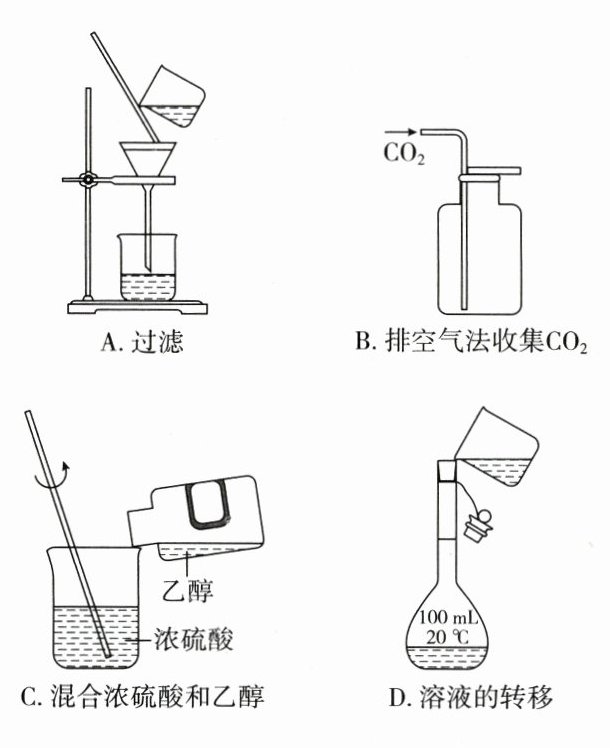 B [过滤时,漏斗下方尖端应紧靠烧杯内壁,A操作不规范;混合浓硫酸和乙醇时,应将浓硫酸缓慢倒入乙醇中,并用玻璃棒不断搅拌,C操作不规范;转移溶液时,应使用玻璃棒引流,D操作不规范。]