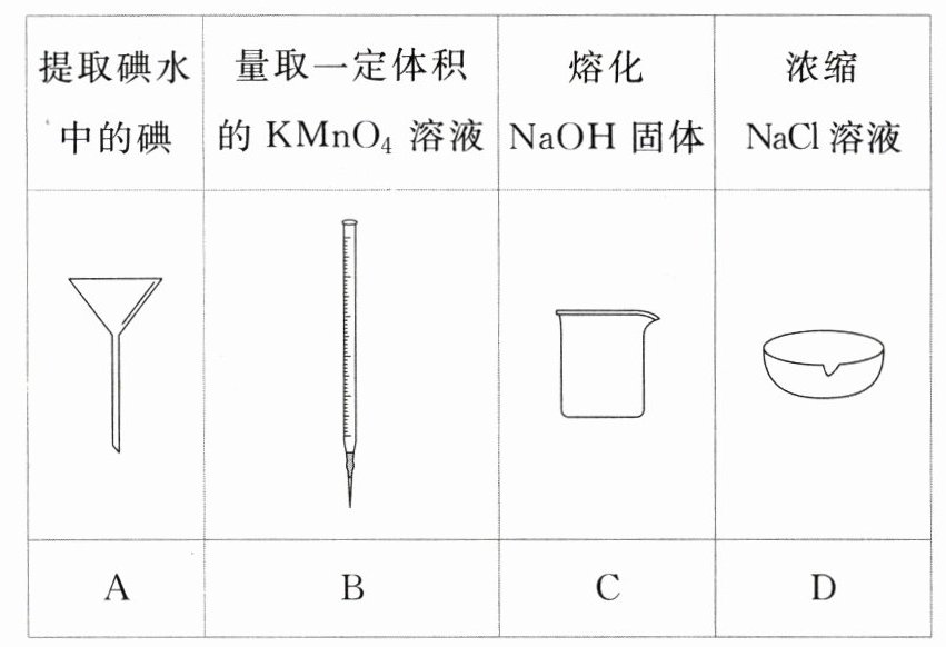 D [提取碘水中的碘应该用萃取的方法,用分液漏斗,A错误;KMnO₄溶液有强氧化性,会将橡胶管腐蚀,应该用酸式滴定管,B错误;应在坩埚中熔化固体,C错误。]