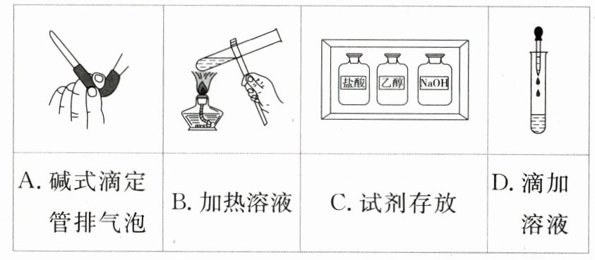 A [用试管加热溶液时,试管夹应夹在距离管口的$\frac{1}{3}$处,B不符合规范;实验室中,盐酸和NaOH、有机物和无机物要分开存放,C不符合规范;用滴管滴加溶液时,滴管不能伸入试管内部,应悬空滴加,D不符合规范。]