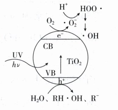 23. 科学家通过研究光催化技术处理环境污染物,原理是基于光催化反应过程中的一些自由基对污染物的氧化或还原作用,反应途径通常是·OH攻击或空穴直接攻击。TiO₂光催化主要反应历程如图所示,当能量大于TiO₂禁带宽度的光照射半导体时,光激发电子跃迁到导带(CB),形成导带电子(e⁻),同时在价带(VB)留下空穴(h⁺)。下列有关说法正确的是 ( )