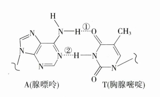 D [O比N对电子的吸引能力强,则氢键的键能:①>②,A正确;由题图中结构可知,腺嘌呤分子中含2个N原子的杂环是类似于苯环的结构,其余三个N原子类似于苯环上的氢原子,故腺嘌呤分子中的所有氮原子均可共面,B正确;该物质中含酰胺基,可发生水解反应,C正确;构成此DNA片段的所有元素为H、C、N、O四种,其中O的电负性最大,D错误。]