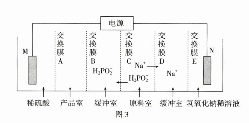 (3)用次磷酸钠通过电渗析法制备次磷酸的装置如图3所示。交换膜A为________(填“阳离子”或“阴离子”)交换膜,电极N的电极反应式为__________________________;当电路中通过$3.8528×10^{5}\ C$电荷量时,制得次磷酸的物质的量为________(1个电子的电荷量为$1.6×10^{-19}\ C$,设阿伏加德罗常数$N_{A}$约为$6.02×10^{23}\ mol^{-1}$)。