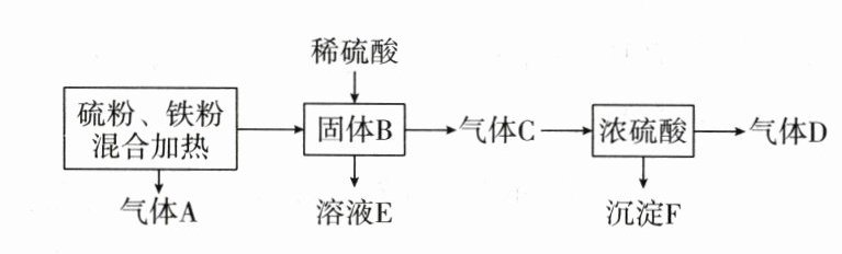 由上述分析知,气体A为SO₂,是氧化产物,气体D为SO₂,是还原产物,A错误。铁粉和硫粉反应生成FeS,S和O₂反应生成SO₂,H₂S和H₂SO₄(浓)反应生成S、SO₂和H₂O,反应中硫元素的化合价都发生改变,故硫元素至少参加了3个氧化还原反应,B错误。沉淀F是S,S与NaOH溶液在加热条件下反应生成Na₂S、Na₂SO₃和H₂O,C正确。固体B为FeS,FeS和浓硫酸反应生成Fe₂(SO₄)₃、S、SO₂和H₂O,其中被氧化的元素为Fe和S,被还原的元素为S,故发生反应时被氧化的和被还原的不全是同种元素,D错误。]