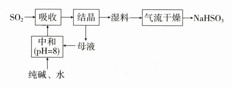 B [根据工艺流程逆向分析可知,以二氧化硫和纯碱为原料得到的结晶成分为NaHSO₃,则母液为饱和NaHSO₃和过量的二氧化硫形成的亚硫酸,溶液呈酸性,所以加入纯碱进行中和,涉及的反应为H₂SO₃ + 2Na₂CO₃ = Na₂SO₃ + 2NaHCO₃,NaHSO₃ + Na₂CO₃ = Na₂SO₃ + NaHCO₃,所以调节pH为8进行中和后得到Na₂SO₃和NaHCO₃,通入二氧化硫气体进行混合吸收,此时吸收过程中发生的反应为Na₂SO₃ + SO₂ + H₂O = 2NaHSO₃↓,SO₂ + NaHCO₃ = CO₂ + NaHSO₃↓,此时会析出大量NaHSO₃晶体,经过分离,将得到的湿料再进行气流干燥,最终得到NaHSO₃产品。根据分析可知,B错误。]