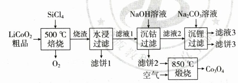 (2)烧渣是$LiCl$、$CoCl_2$和$SiO_2$的混合物,“$500\ ^{\circ}C$焙烧”后剩余的$SiCl_4$应先除去,否则水浸时会产生大量烟雾,用化学方程式表示其原因 。