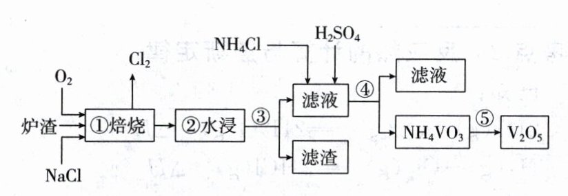 (1)在第一步操作焙烧过程中$V_2O_5$转化为可溶性$NaVO_3$,该反应的化学方程式为 。