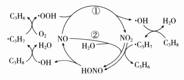 D [根据题图反应机理知,含 N 分子发生的反应有 NO + ·OOH = NO₂ + ·OH、NO + NO₂ + H₂O = 2HONO、NO₂ + C₃H₇ = C₃H₆ + HONO、HONO = NO + ·OH,含 N 分子 NO、NO₂、HONO 中 N 元素的化合价依次为 +2 价、+4 价、+3 价,上述反应中均有元素化合价的升降,都为氧化还原反应,一定有电子转移,A 正确;根据题图,由 NO 生成 HONO 的反应历程有 2 种,B 正确;NO 是催化剂,增大 NO 的量,C₃H₈ 的平衡转化率不变,C 正确;无论反应历程如何,在 NO 催化下丙烷与 O₂ 反应制备丙烯的总反应都为 2C₃H₈ + O₂ =(NO) 2C₃H₆ + 2H₂O,当主要发生包含②的历程时,最终生成的水不变,D 错误。]