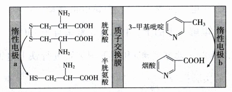 [此处有半胱氨酸相关的化学结构及反应式:S - CH₂ - CH(NH₂) - COOH + 2e⁻ + 2H⁺ = 2HS - CH₂ - CH(NH₂) - COOH,为阴极,电极b发生氧化反应:[此处有烟酸相关的化学结构及反应式:含甲基的吡啶结构 + 2H₂O - 6e⁻ = 含羧基的吡啶结构 + 6H⁺,为阳极。由上述分析可知A、C正确;H⁺从阳极移向阴极,B正确;根据得失电子守恒知,生成6 mol半胱氨酸的同时生成1 mol烟酸,D错误。]