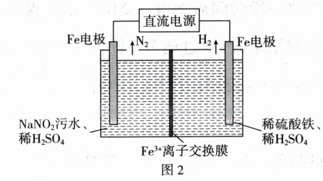 (2)经测定某污水里$NaNO_{2}$含量为$4.6\%$,科研人员研究发现可用如图2所示的装置处理污水中的$NaNO_{2}$,原理是利用$Fe^{2 + }$把$NO_{2}^{-}$还原成$N_{2}$。
