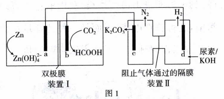 14.(1)(2023·重庆九龙坡高三二模)某实验小组用$Zn - CO_{2}$水介质电池电解含有尿素的碱性废水,装置如图1(电极a为$Zn$,b、c、d均为惰性电极)。
