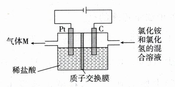 C [Pt是阴极,在阴极上是氢离子得电子的还原反应,电极反应式为2H⁺ + 2e⁻ = H₂↑,不可用湿润的淀粉 - KI试纸检测氢气,A错误;由图可知,石墨电极是阳极,该电极上发生失电子的氧化反应,电极反应式为NH₄⁺ - 6e⁻ + 3Cl⁻ = NCl₃ + 4H⁺,B错误;电解过程中,质子交换膜右侧每生成1 mol NCl₃同时生成4 mol H⁺,理论上有6 mol H⁺经质子交换膜由右侧向左侧迁移,右侧溶液的c(H⁺)减小,pH增大,C正确;由于气体所处的状况未知,无法计算氢气的体积,D错误。]