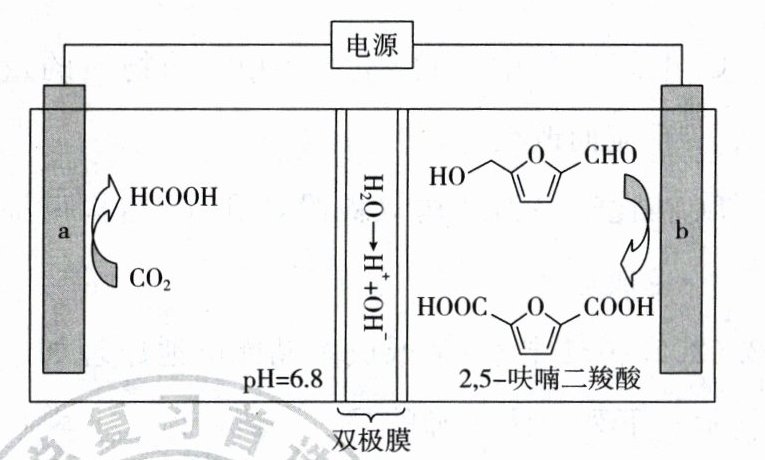 19.(2023·金版原创)北京化工大学的科研工作者研究出将$CO_{2}$转化为甲酸,同时将5 - 羟甲基糠醛转化为2,5 - 呋喃二羧酸的电化学增值装置,工作原理如图所示。图中的双极膜中间层中的$H_{2}O$解离为$H^{+}$和$OH^{-}$,并在直流电场作用下分别向两极迁移。