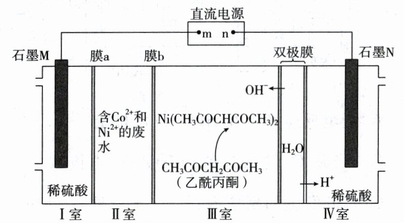 B [这是一个电解池,根据溶液中离子移动方向,可知左侧石墨M为阳极,右侧石墨N为阴极,Ⅱ室为原料室,膜b为阳离子交换膜,Co²⁺、Ni²⁺进入Ⅲ室,Co²⁺和乙酰丙酮不反应,Ni²⁺和乙酰丙酮反应。石墨N为阴极,电极反应为2H⁺ + 2e⁻ = H₂↑,Ⅳ室内消耗的H⁺与转移过来的H⁺相等,所以硫酸浓度不变,B错误。]