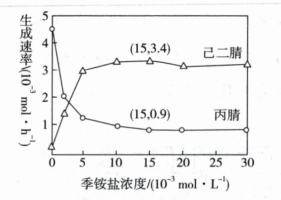 (4)己二腈、丙腈的生成速率与季铵盐浓度的关系如图,当季铵盐的浓度为$1.5×10^{-2}mol·L^{-1}$时,每小时通过质子交换膜的$H^{+}$的物质的量最少为______mol。