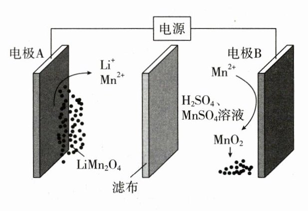 4.(2022·浙江6月选考)通过电解废旧锂电池中的$\mathrm{LiMn}_{2}\mathrm{O}_{4}$可获得难溶性的$\mathrm{Li}_{2}\mathrm{CO}_{3}$和$\mathrm{MnO}_{2}$,电解示意图如下(其中滤布的作用是阻挡固体颗粒,但离子可自由通过。电解过程中溶液的体积变化忽略不计)。下列说法不正确的是( )