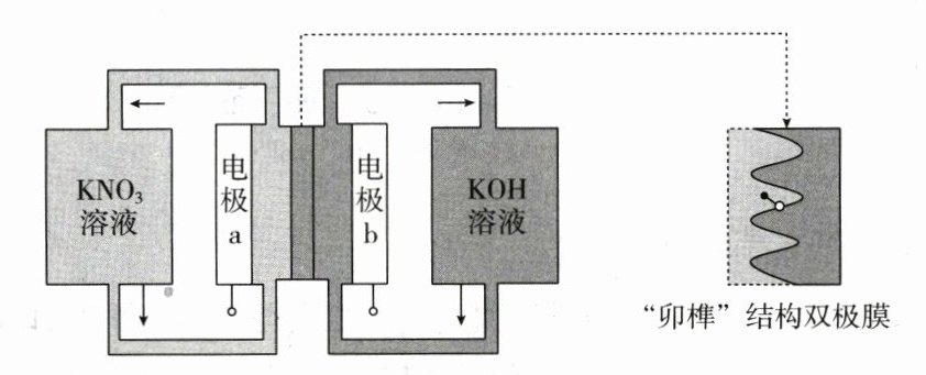 1.(2023·广东卷)用一种具有“卯榫”结构的双极膜组装电解池(下图),可实现大电流催化电解$\mathrm{KNO}_{3}$溶液制氨。工作时,$\mathrm{H}_{2}\mathrm{O}$在双极膜界面处被催化解离成$\mathrm{H}^{+}$和$\mathrm{OH}^{-}$,有利于电解反应顺利进行。下列说法不正确的是( )