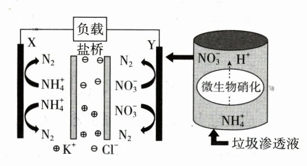 A X 极为 NH₄⁺转变为 N₂,发生了氧化反应,为负极,而 Y 极为 NO₃⁻转变为 N₂,发生了还原反应,为正极。X 电极反应为 2NH₄⁺ - 6e⁻ = N₂↑ + 8H⁺,A 错误。