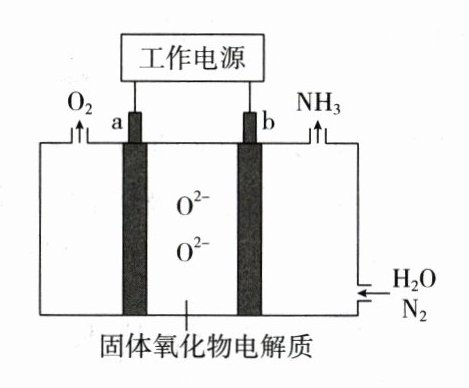 A由装置图可知,N₂ 在 b 电极转化为 NH₃,N 元素的化合价降低,得电子发生还原反应,因此 b 电极为阴极,电极反应式为 N₂ + 3H₂O + 6e⁻ = 2NH₃ + 3O²⁻,a 电极为阳极,电极反应式为 2O²⁻ - 4e⁻ = O₂;由分析可知 A 正确;a 电极为阳极,若金属 Ag 作 a 电极的材料,则金属 Ag 优先失去电子,B 错误;改变工作电源的电压,反应速率会发生改变,C 错误;电解过程中,固体氧化物电解质中 O²⁻不会改变,D 错误。