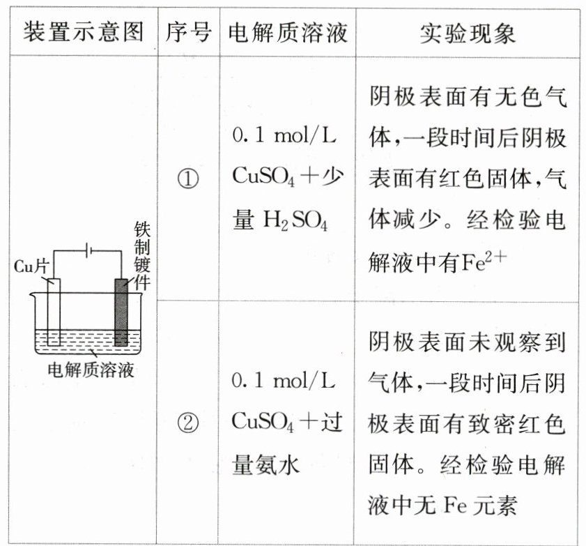 D. ②中$\mathrm{Cu}^{2 + }$生成$[\mathrm{Cu}(\mathrm{NH}_{3})_{4}]^{2 + }$,使得$c(\mathrm{Cu}^{2 + })$比①中溶液的小,$\mathrm{Cu}$缓慢析出,镀层更致密