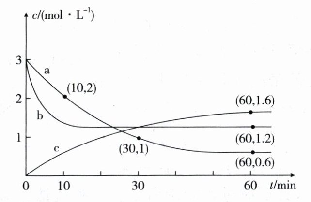 C [曲线a、b都在下降,说明a、b都是A物质的浓度变化情况,且b先达到平衡,反应速率更快,故b对应的温度是T₂。根据物质的量浓度的变化量,结合反应方程式可知曲线c为T₁温度下的B的浓度随时间的变化曲线。恒容条件下充入He,各物质的分压没有发生改变,平衡不移动,A错误;a曲线条件下,10~30 min内v(A) = $\frac{2 mol·L⁻¹ - 1 mol·L⁻¹}{20 min}$ = 0.05 mol·L⁻¹·min⁻¹,反应速率之比等于化学计量数之比,则v(B) = $\frac{2}{3}$v(A) = $\frac{2}{3}$×0.05 mol·L⁻¹·min⁻¹,B错误;结合分析可知,a、b都是A物质的浓度变化情况,b对应的是T₂温度,C正确;降低温度,平衡正向移动,反应物的平衡转化率提升,但温度过低会导致反应速率过慢,不利于提高生产效率,D错误。]