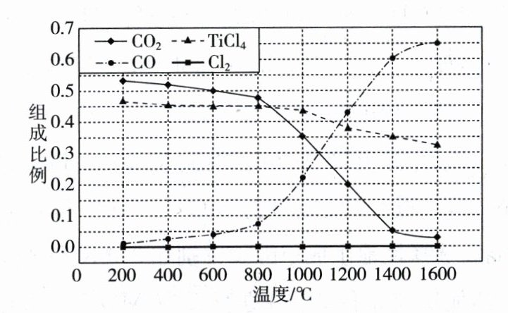 (2)在$1.0×10^5\ Pa$,将$TiO_2$、$C$、$Cl_2$以物质的量比$1:2.2:2$进行反应。体系中气体平衡组成比例(物质的量分数)随温度变化的理论计算结果如图所示。