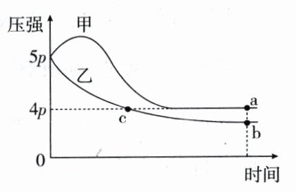 则有$\frac{[(2 - 2x) + (1 - x) + 2x]mol}{(1 + 2)mol} = \frac{4p}{5p}$,计算得到x = 0.6,那么化学平衡常数$K = \frac{c^{2}(SO_{3})}{c^{2}(SO_{2}) \cdot c(O_{2})} = \frac{1.2^{2}}{0.8^{2}×0.4} = 5.625$,又因为甲容器为绝热条件,随着反应的进行,体系温度升高、压强增大,若想压强仍为4p,需体系中总物质的量减小,即反应继续正向进行,则平衡常数K>5.625,B错误。根据A项分析可知,题述密闭容器中的反应为放热反应,图中a点和c点的压强相等,因甲容器中为绝热过程,乙容器中为恒温过程,若两者气体物质的量相等,则甲容器压强大于乙容器压强,则说明此时甲容器中气体的总物质的量小于乙容器中气体的总物质的量,C正确。根据图像可知,甲容器达到平衡的时间短,温度高,所以$v_{a}>v_{b}$,D错误。]