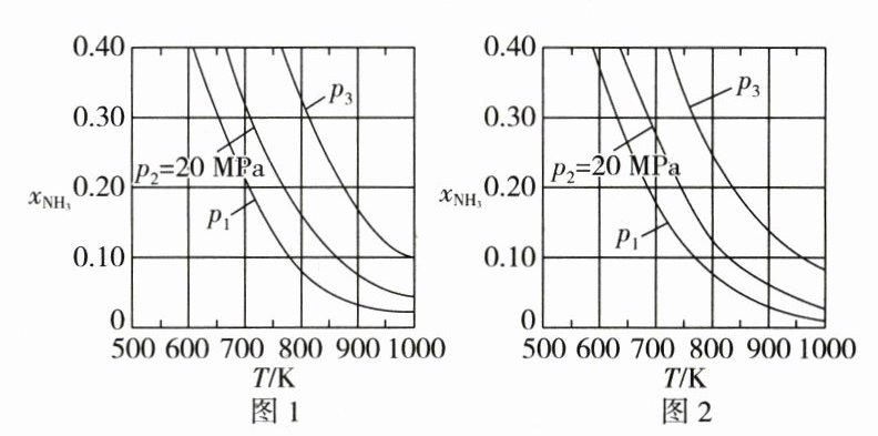 (3)图 1 中,当$p_{2} = 20\ \mathrm{MPa}$、$x_{\mathrm{NH}_{3}} = 0.20$时,氮气的转化率$\alpha =$__________。该温度时,反应$\frac{1}{2}\mathrm{N}_{2}(\mathrm{g})+\frac{3}{2}\mathrm{H}_{2}(\mathrm{g})\rightleftharpoons\mathrm{NH}_{3}(\mathrm{g})$的平衡常数$K_{\mathrm{p}} =$__________$(\mathrm{MPa})^{-1}$(化为最简式)。