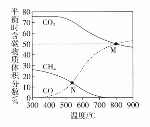 在恒容条件下,按$n(\mathrm{CO}_{2}):n(\mathrm{H}_{2}) = 1:1$投料比进行反应,平衡时含碳物质体积分数随温度的变化如图所示。下列说法正确的是( )