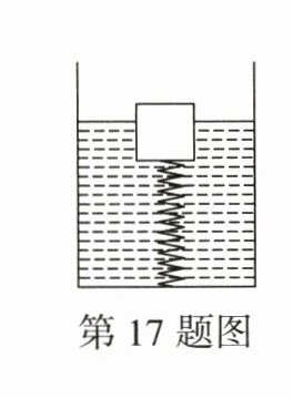17. 如图所示,轻质弹簧下端固定在容器底部,上端与一个棱长为0.1 m、质地均匀的正方体物块连接. 现向容器内注水,当水达到一定深度时,弹簧恰好恢复原长(弹簧拉力为0),物块静止漂浮,此时物块有$\frac{1}{4}$的体积露出水面.(ρ水 = 1.0×10³ kg/m³,g取10 N/kg)求: