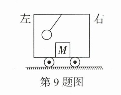 9. 在一辆小车内用细线竖直悬挂一小球,并放置一个物体M.当小车在水平地面上运动时,某时刻车内的情形如图所示,此时物体M相对于小车静止,下列分析错误的是 ( )