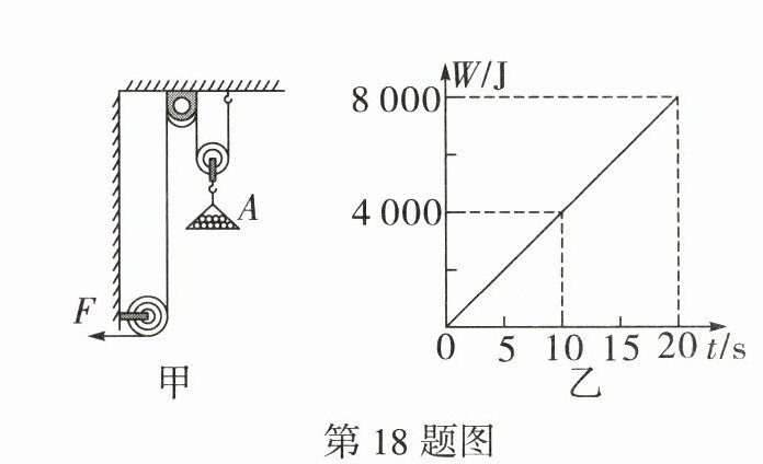 18. 如图甲所示是建筑工地上使用的小型“罐笼式”提升机,它能将不易捆绑的建筑材料放入罐笼A中提升到高处,某次在不使用罐笼的情况下,在拉力F的作用下,将重为500 N的重物以0.5 m/s的速度匀速提升. 拉力F做的功W随时间t的变化图像如图乙所示.(不计绳重和滑轮与轴之间的摩擦,g取10 N/kg)求: