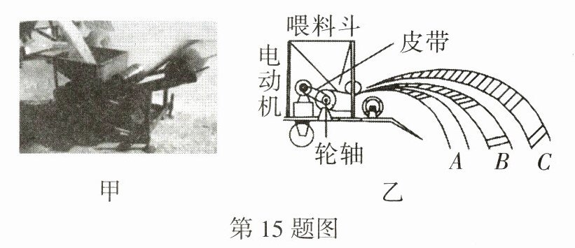 15. (趋势情境 跨学科·日常生活)如图甲所示为农用扬场机扬场的情形. 谷物脱粒后,谷粒、糠皮及少量碎石的混合物在快速转动的轮轴和皮带的带动下被抛出,谷粒、糠皮、碎石落地的远近不同,从而形成A、B、C三堆,达到分离的目的,如图乙所示.