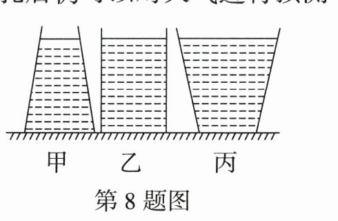 8. 如图所示,水平桌面上放有底面积均相同的甲、乙、丙三个平底容器,分别装有深度相同、质量相等的不同液体. 若不计容器质量,下列说法正确的是 ( )
