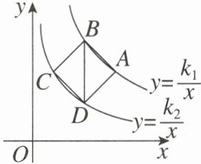 12. 如图,正方形$ABCD$的顶点分别在反比例函数$y = \frac{k_1}{x}(k_1>0)$和$y = \frac{k_2}{x}(k_2>0)$的图象上. 若$BD// y$轴,点$D$的横坐标为3,则$k_1 + k_2$的值为 ( )