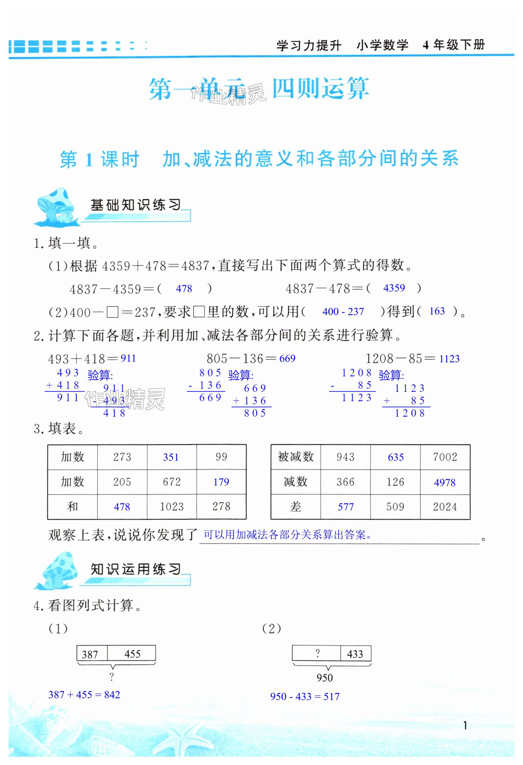 2025年学习力提升四年级数学下册人教版 参考答案第1页