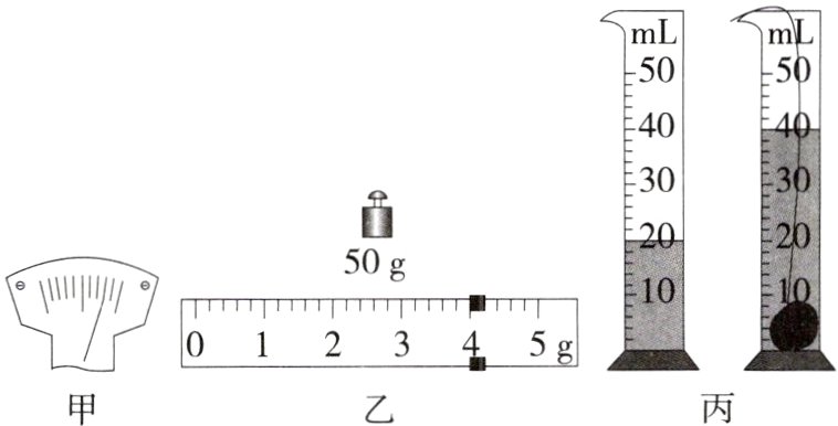 3. (2023 广东深圳福田校级期末)如图所示,用托盘天平和量筒测量一石块的密度,图甲是天平在某时刻分度盘指针的位置,图乙是天平调平后测量石块质量,天平平衡时右盘中砝码和游码的情形,图丙是测量石块体积的情形。下列说法正确的是 ( )
