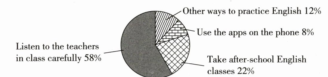 It's known that Chinese students pay much attention to listening and speaking when they learn English.However,reading and writing also play an important role in English learning.Recently,we have a survey about how to learn English well in our school.The number of the total students is about500.The chart shows their answers.