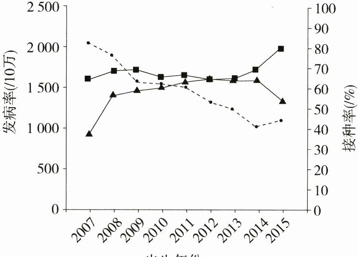 1.水痘是由水痘—带状疱疹病毒(VZV)引起的急性呼吸道传染病,多见于儿童,临床特征为全身出现丘疹、水疱。接种VZV减毒活疫苗(VarV)是预防水痘流行的有效方法。2019年,研究者对某地2007 ~ 2015年出生儿童的VarV接种率及水痘发病率进行了调查,结果如图。