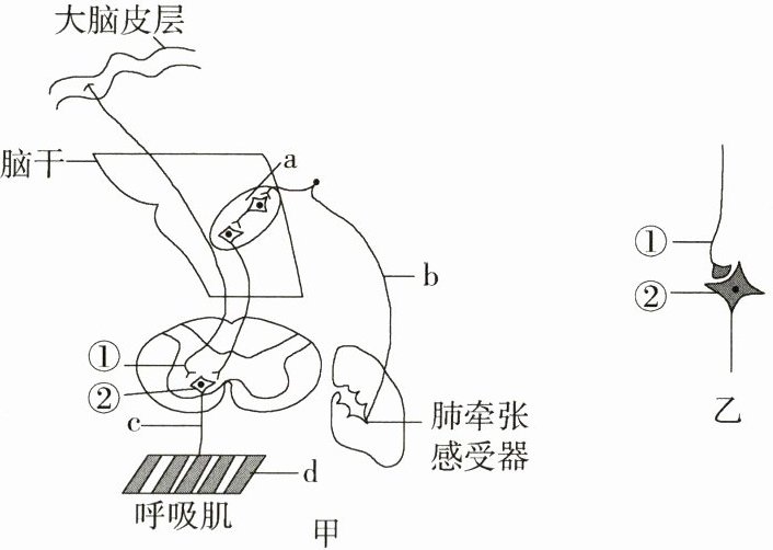 8.肺牵张反射是调节呼吸的反射之一,该反射的感受器位于肺中。图甲为肺牵张反射示意图,神经元①和②之间形成的突触放大后如图乙所示。深吸气后肺扩张,感受器兴奋,神经冲动经传入神经传入脑干,抑制吸气,引起呼气。下列说法错误的是 ( )