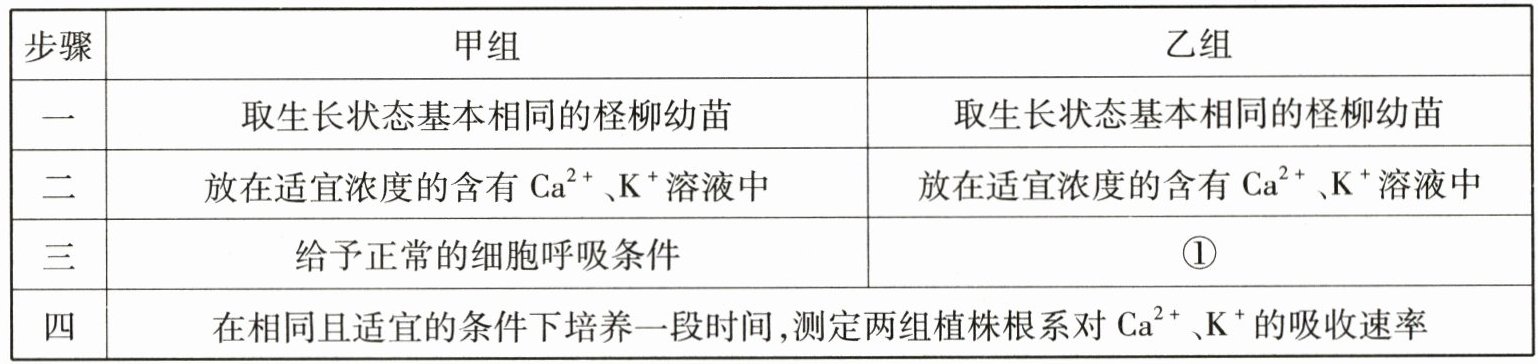 16. [2024武汉二中高一期末]柽柳是强耐盐植物,它的叶子和嫩枝可以将吸收到植物体内的无机盐排出体外。某同学做实验探究柽柳的根部吸收无机盐离子是主动运输还是被动运输,实验过程如表。