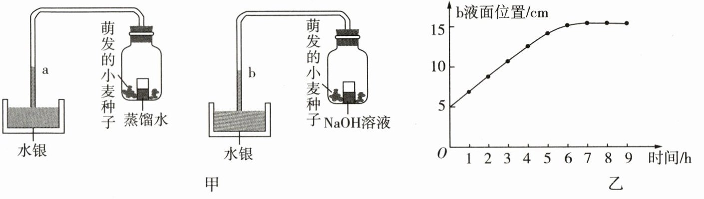 17. [2024青岛二中高一月考]某同学将活性良好的小麦种子在水中浸透,然后按图甲装置进行实验,开始时a、b液面的高度一致,图乙表示实验过程中b液面位置的变化(假设种子呼吸底物为葡萄糖,实验过程中不考虑温度对气体体积的影响)。下列说法错误的是 ( )