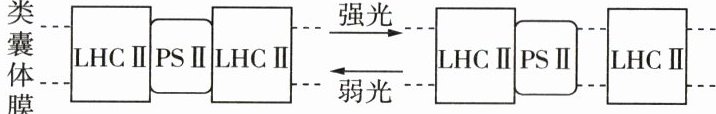 18. [2023湖北卷改编]植物光合作用的光反应依赖类囊体膜上PSⅠ和PSⅡ光复合体,PSⅡ光复合体含有光合色素,能吸收光能,并分解水。研究发现,PSⅡ光复合体上的蛋白质LHCⅡ,通过与PSⅡ结合或分离来增强或减弱对光能的捕获(如图所示)。LHCⅡ与PSⅡ的分离依赖LHC蛋白激酶的催化。下列叙述错误的是 ( )