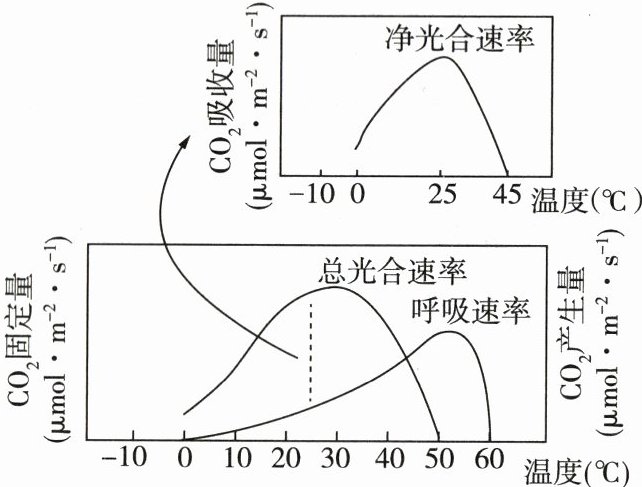 19. [2024南昌二中高一月考]生产实践中需注意控制环境温度,避免低温和高温对植物光合作用的不利影响,提供植物生长发育的最适温度环境,可达到稳产、高产的目的。黄瓜光合速率、呼吸速率与温度的关系如图所示。下列说法正确的是 ( )