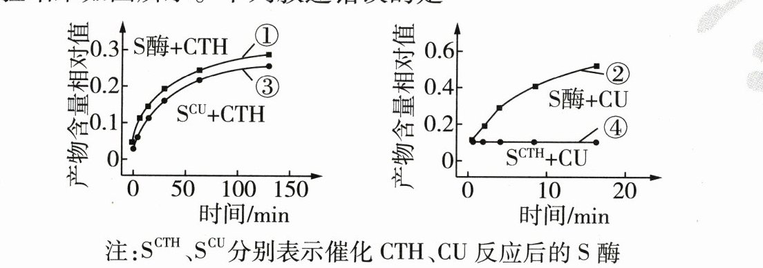 20. [2024海南中学高一月考]“诱导契合”学说认为在与底物结合之前,酶的空间结构不完全与底物互补,在底物的作用下,可诱导酶出现与底物相结合的互补结构,继而完成酶促反应,而“锁钥”学说认为酶具有与底物相结合的互补结构。为验证上述两种学说,科研人员利用枯草杆菌蛋白酶(S酶,该酶可催化两种结构不同的底物CTH和CU,且与两者结合的催化中心位置相同)进行研究,得到的四组实验结果如图所示。下列叙述错误的是 ( )