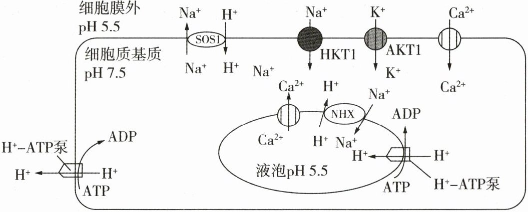 (3)据图可知,耐盐植物根细胞的细胞质基质与细胞液、细胞膜外的pH不同,这种差异主要由H⁺ - ATP泵将H⁺转运到________来维持。这种H⁺分布特点为图中的两种转运蛋白________运输Na⁺提供了动力,Na⁺的这种转运方式对细胞代谢的影响较小。